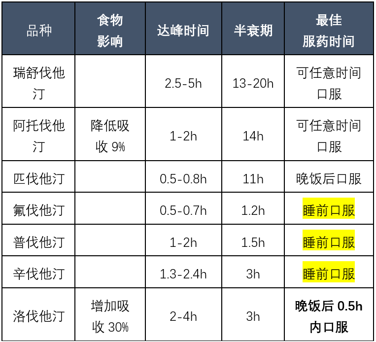 每种他汀的服药时间在上表中,需要的朋友可以保存图片,也可以收藏本文。看不明白的朋友,直接看最后一列的最佳服药时间就可以啦。